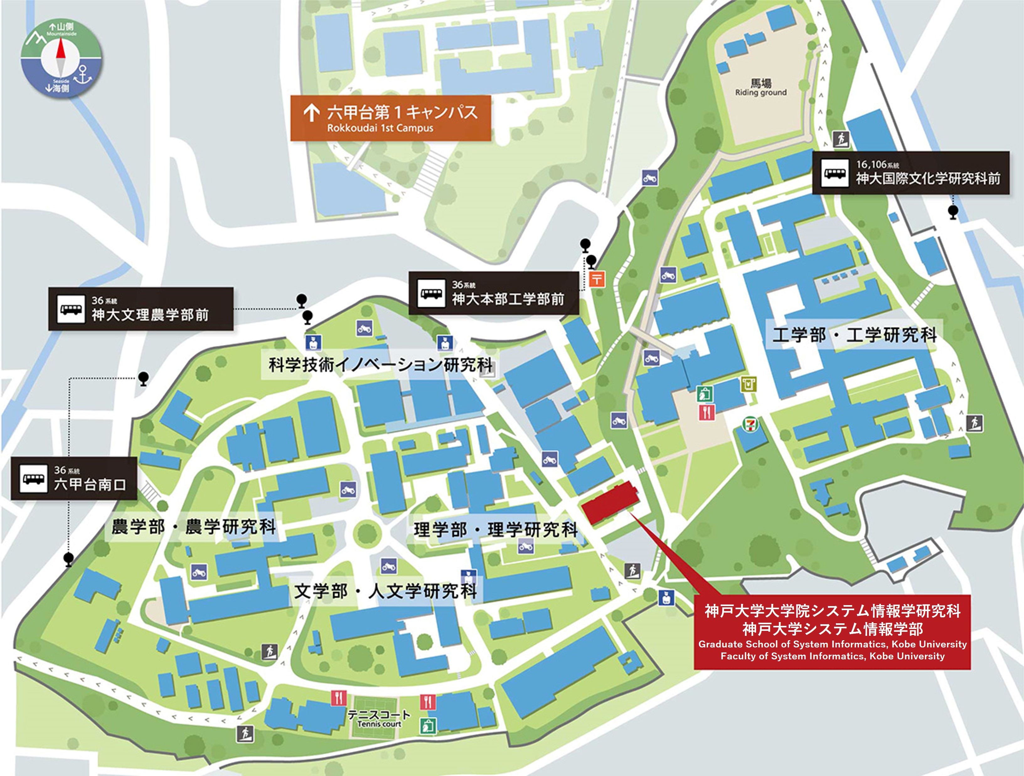 地図(神戸大学のキャンパスマップサイトにリンクしています。マップ中の77番のビルがシステム情報学研究棟です。)