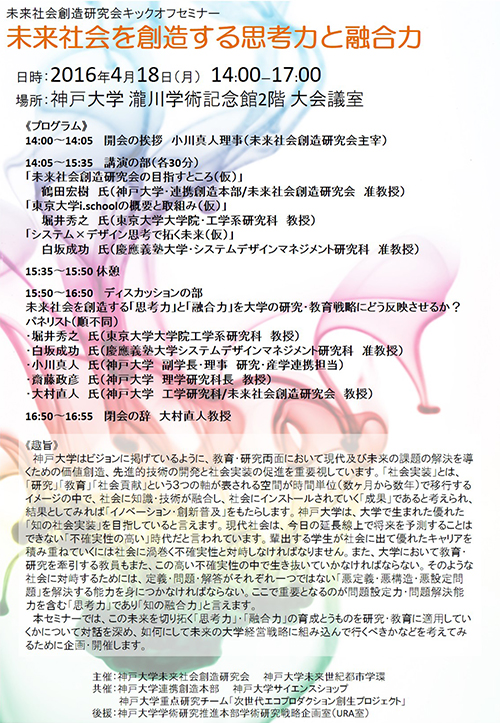 神戸大学はビジョンに掲げているように、教育・研究両面において現代及び未来の課題の解決を導くための価値創造、先進的技術の開発と社会実装の促進を重要視しています。「社会実装」とは、「研究」「教育」「社会貢献」という3つの軸が表される空間が時間単位(数ヶ月から数年)で移行するイメージの中で、社会に知識・技術が融合し、社会にインストールされていく「成果」であると考えられ、結果としてみれば「イノベーション・創新普及」をもたらします。神戸大学は、大学で生まれた優れた「知の社会実装」を目指していると言えます。現代社会は、今日の延長線上で将来を予測することはできない「不確実性の高い」時代だと言われています。輩出する学生が社会に出て優れたキャリアを積み重ねていくには社会に渦巻く不確実性と対峙しなければなりません。また、大学において教育・研究を牽引する教員もまた、この高い不確実性の中で生き抜いていかなければならない。そのような社会に対峙するためには、定義・問題・解答がそれぞれ一つではない「悪定義・悪構造・悪設定問題」を解決する能力を身につかなければならない。ここで重要となるのが問題設定力・問題解決能力を含む「思考力」であり「知の融合力」と言えます。 本セミナーでは、この未来を切り拓く「思考力」・「融合力」の育成とうものを研究・教育に適用していくかについて対話を深め、如何にして未来の大学経営戦略に組み込んで行くべきかなどを考えてみるために企画・開催します。