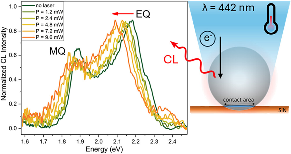 Many nanoscale technologies depend critically on precise knowledge and control of local temperature and heat flow, making robust nanothermometry essential for designing, optimizing, and ensuring the reliability of next-generation devices. In this work, we introduce a correlative method that combines laser excitation with scanning electron microscopy-based cathodoluminescence (SEM-CL) to probe photothermal effects in situ with nanoscale spatial resolution. We analyze the spatially resolved CL (30 keV) of resonant Mie modes in single silicon nanoparticles under continuous-wave laser irradiation (λ = 442 nm). The 235–250-nm-diameter crystalline nanospheres, placed on a Si3N4 membrane, show a strong electric quadrupole CL resonance of which the peak wavelength reversibly red-shifts upon laser-induced heating. A temperature of up to 585 ± 12 °C is derived from the spectral shifts for the highest laser power used (9.6 mW, ∼1 × 106 W/cm2 at the substrate). Numerical heat flow simulations show that the measured steady-state temperatures are consistent with a geometry in which heat flow occurs through a contact area of up to 100 nm2, depending on laser power, between the Si nanosphere and the Si3N4 membrane. We postulate that this contact forms by reshaping of the particle–membrane geometry as it heats up in the initial phase of the laser irradiation, leading to an equilibrium geometry that results in the measured steady-state temperature. This work shows that CL of resonant nanostructures in combination with simulations can serve as sensitive probes of temperature and thermal conductivity. Spatially resolved CL nanothermometry in a SEM enables studies of nanoscale thermal properties of a wide range of device geometries such as electronic integrated circuits, surface catalysts, photovoltaic devices, and more.